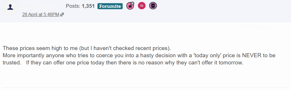 Pushy sales tactics – including “today only” prices, which many forum users specifically warned against. These offers can be high-pressure sales tactics designed to stop you from exploring other options.