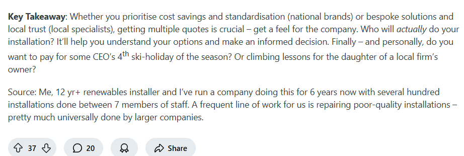 Another forum user compared quotes and discovered their chosen local installer, recommended by several neighbours, offered a quote 50% lower than a well-known national brand, with more panels and greater battery capacity included.