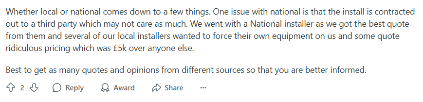 One Reddit user found that, during their search for solar panels, national companies were typically £1,000–£2,000 more expensive than local companies for the same number of panels and battery capacity. We found this was a common opinion shared by users.